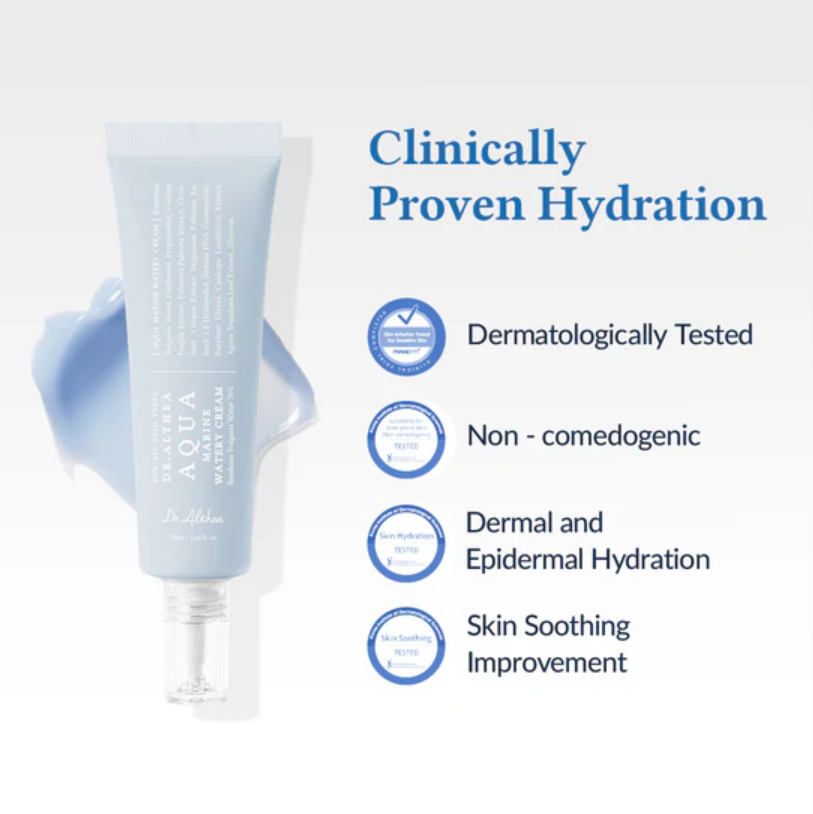 Dr. Althea Aqua Marine Watery Cream is an ultra-lightweight water-based moisturizer designed to deliver intense, clinically proven hydration without heaviness. Infused with marine-inspired hydrating ingredients, this cream deeply moisturizes the skin while keeping it fresh, calm, and breathable.