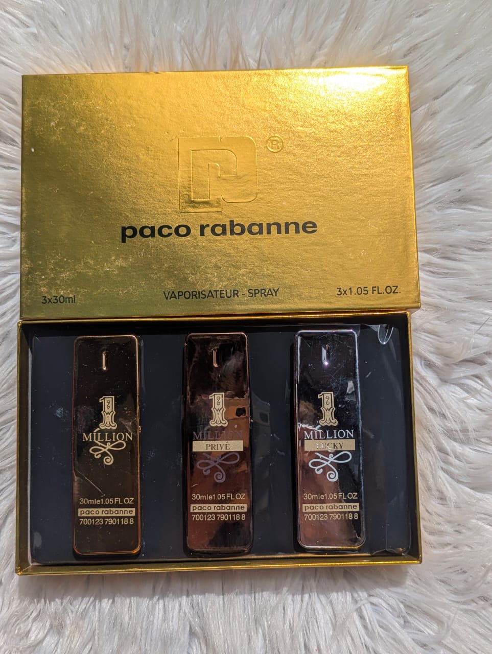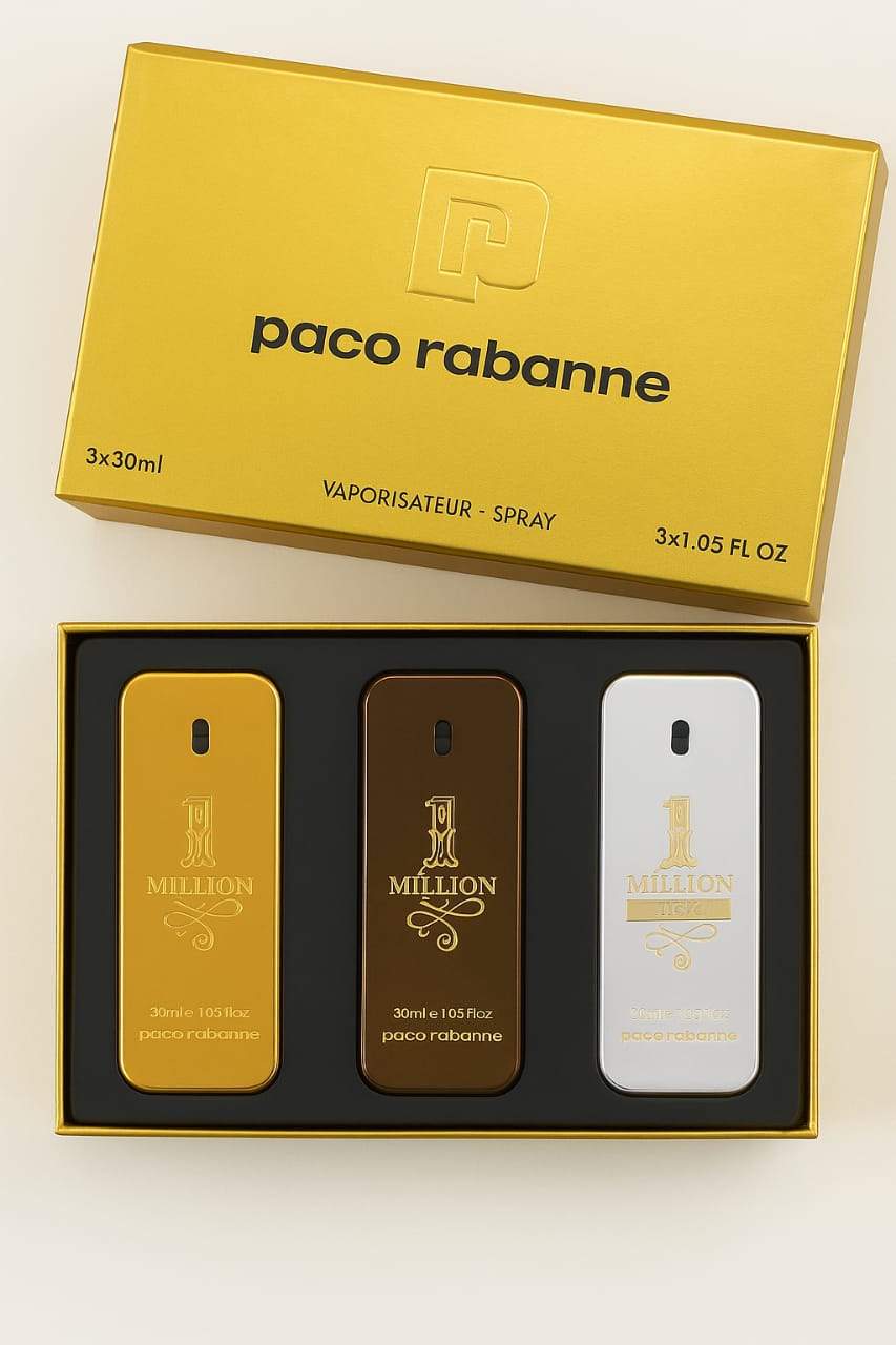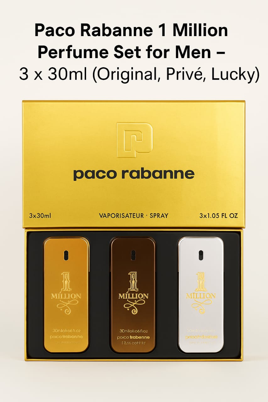 Elevate your scent game with the Paco Rabanne 1 Million Perfume Set, a premium collection of three 30ml bottles featuring the brand’s most iconic masculine fragrances: