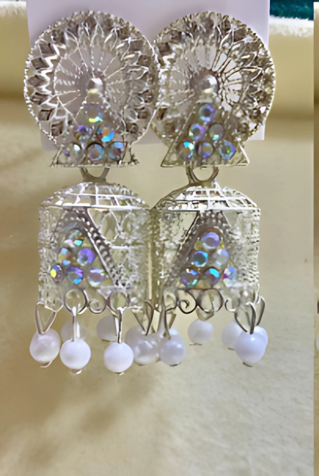 Elevate your ethnic look with these intricately designed traditional jhumka earrings. Crafted from silver-plated metal and adorned with iridescent stones and dangling pearl beads, these earrings bring a timeless charm to any outfit. The filigree design on the top complements the bell-shaped jhumka below, making them perfect for festive occasions, weddings, or cultural celebrations.